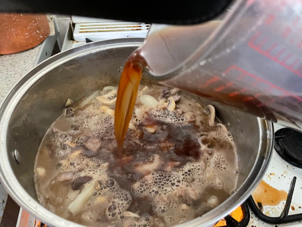 250 ml of Beef or Red Wine (I found a bottle of beer in the back of the cupboard leftover from christmas last year)